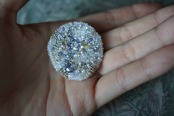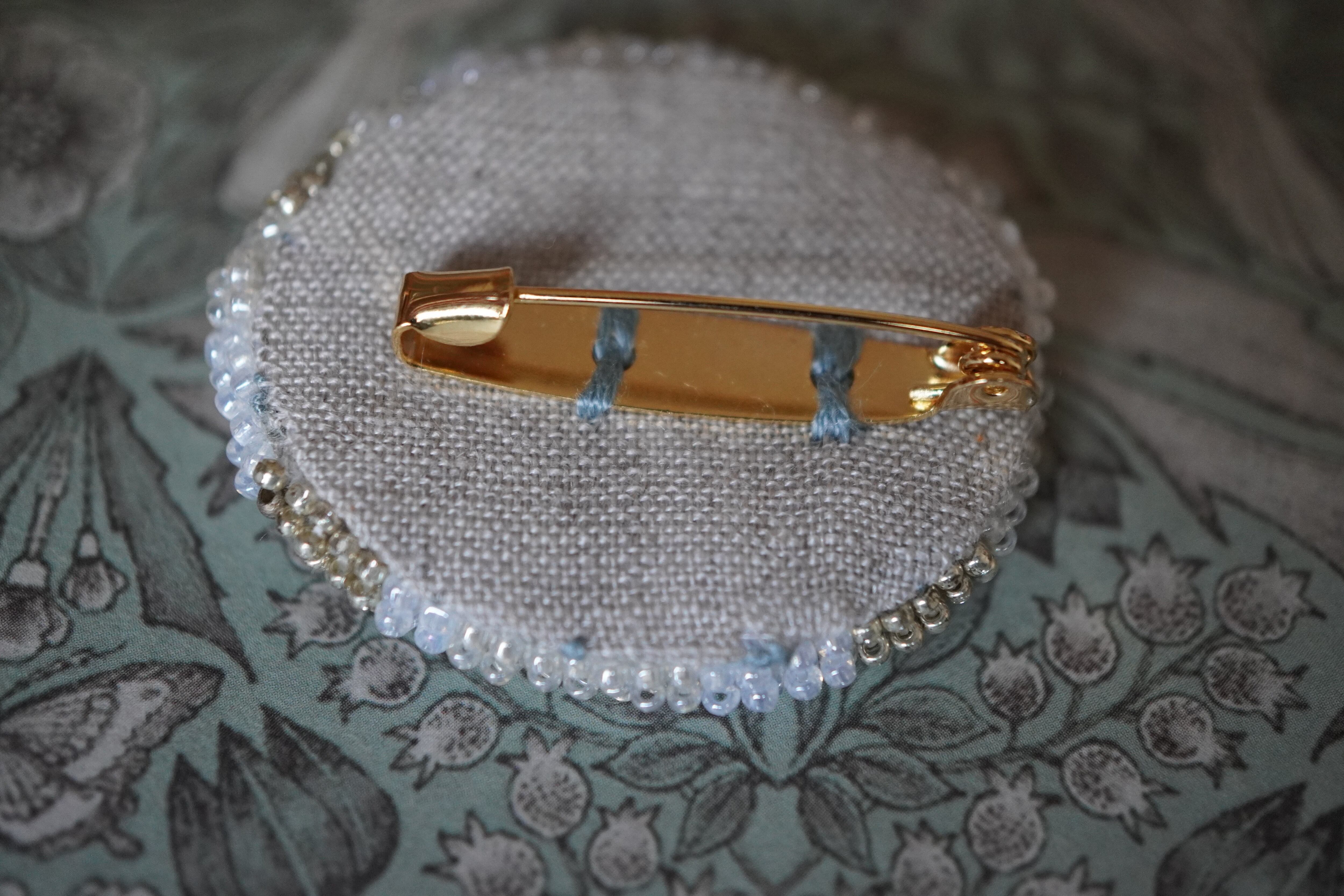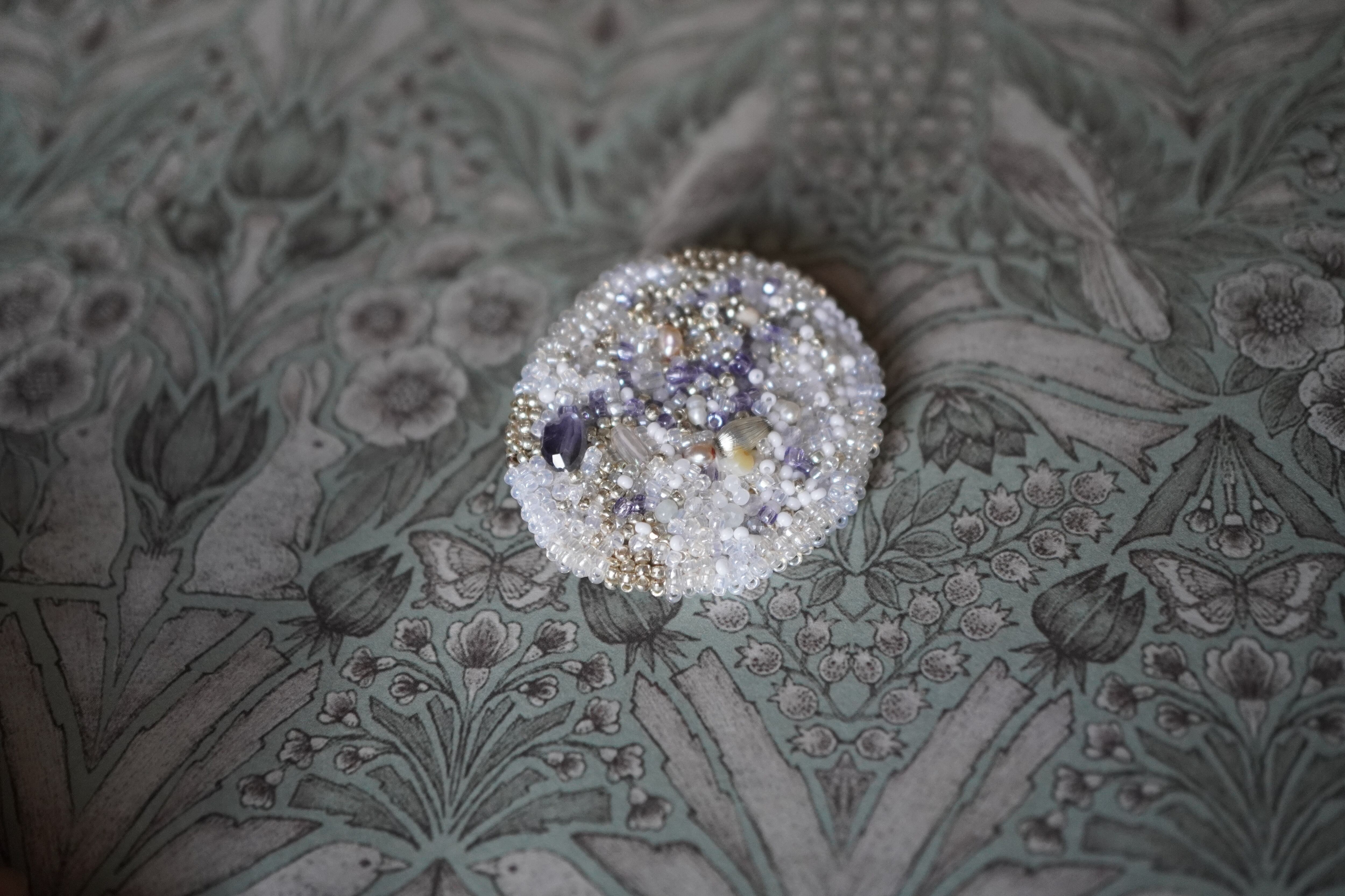 透明感のあるガラスビーズ、ラベンダーカラーのビンテージビーズ、スフレガラス、パール、アイオライト、イエローシェル、リバーストーン、ラブラドライト、翡翠を散りばめ、手刺繍で丁寧に仕上げた一点ものブローチです。