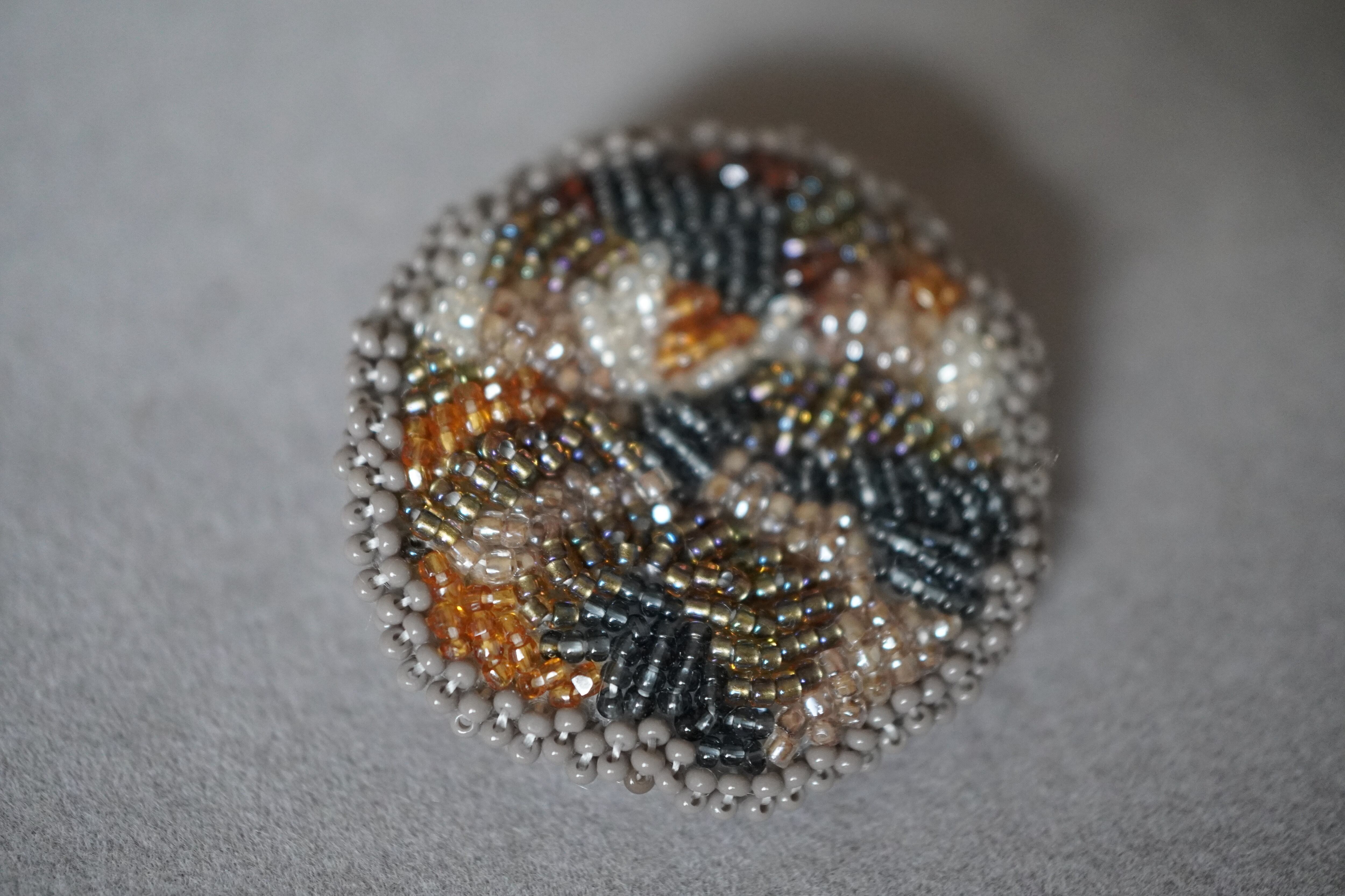 - 材質:ガラスビーズ、ビンテージビーズ、リネン、フェルト、ポリエステル糸、刺繍糸、ブローチ金具