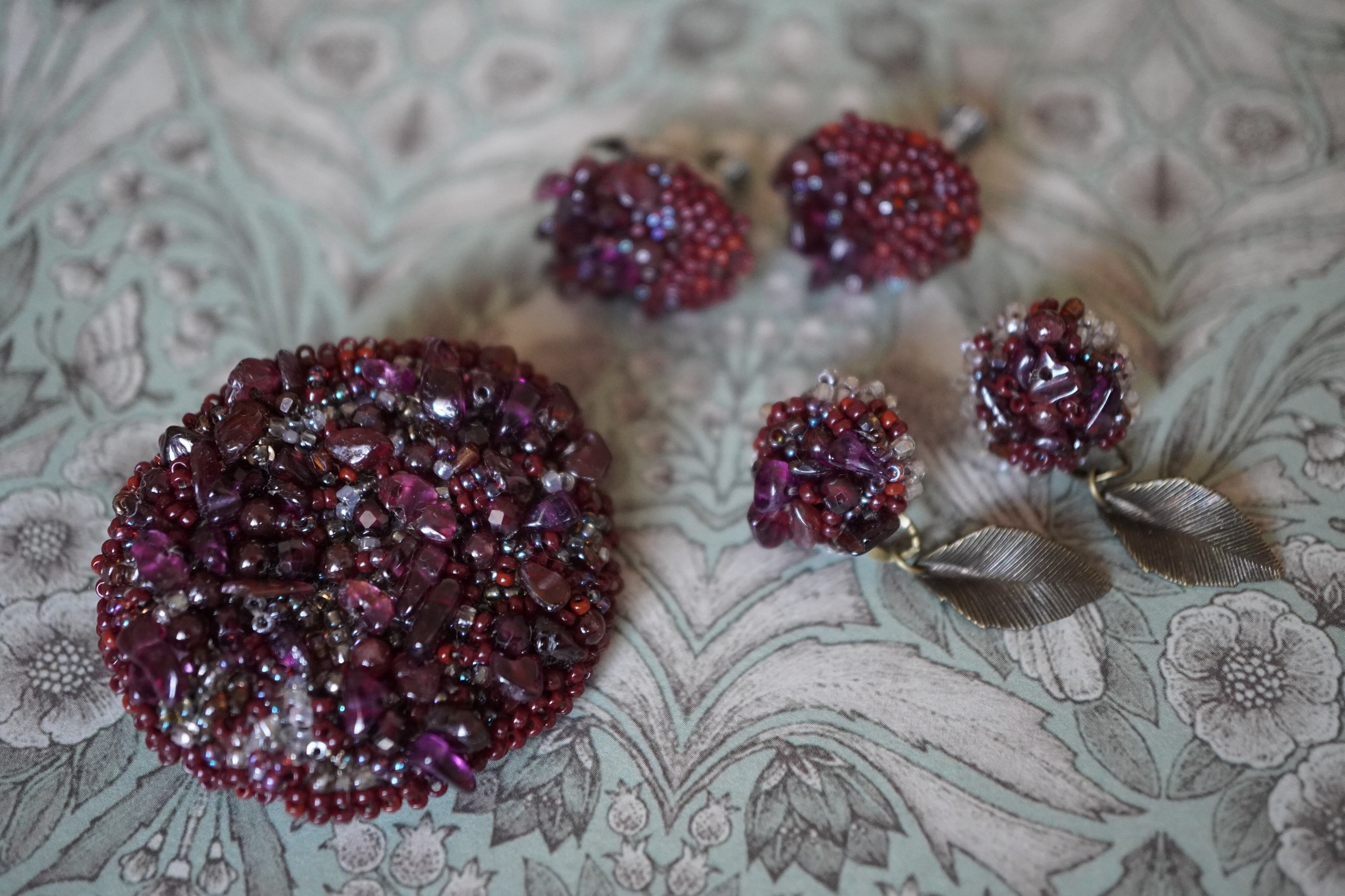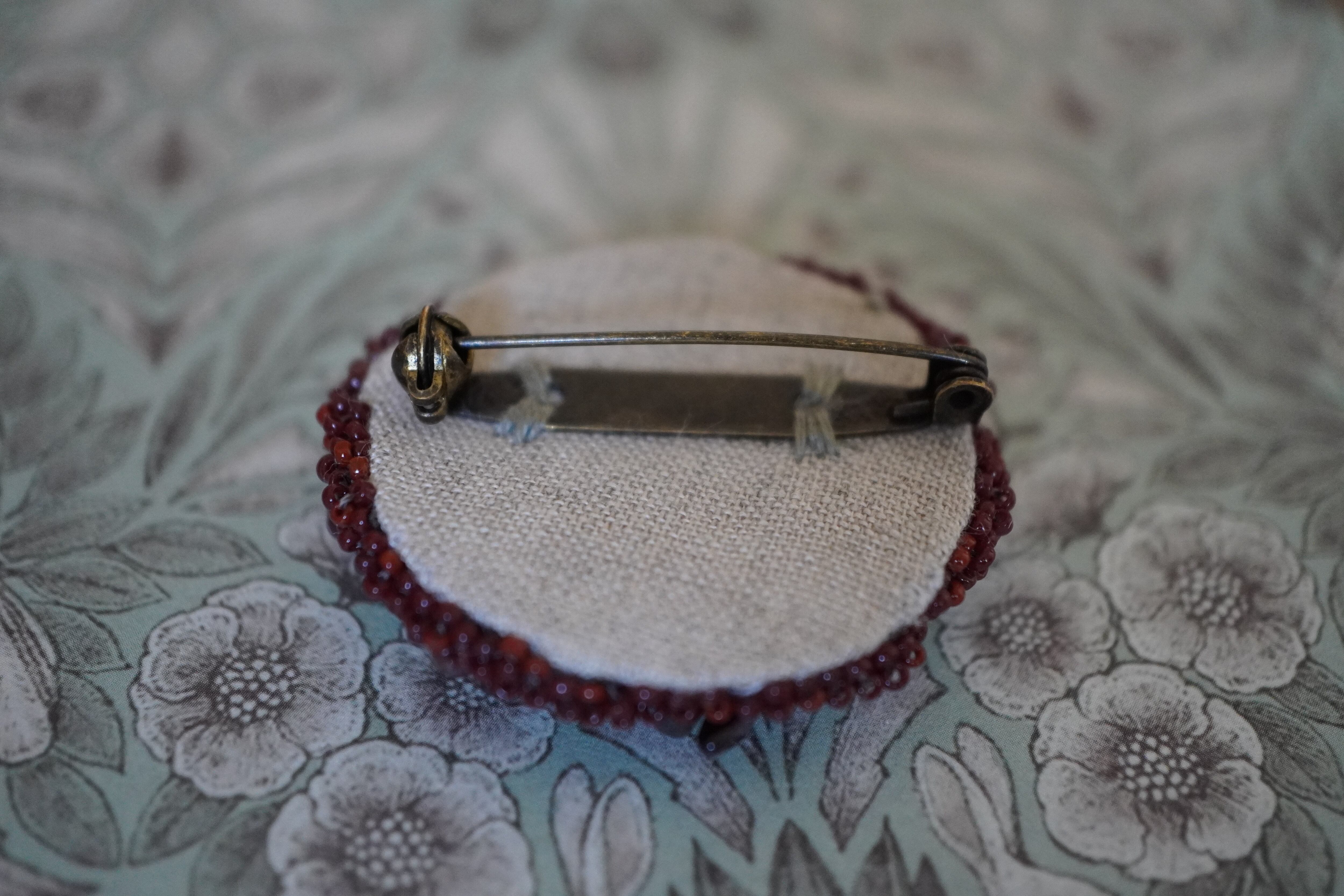 - 材質:ガーネット、ガラスビーズ、リネン、フェルト、ポリエステル糸、刺繍糸、ブローチ金具