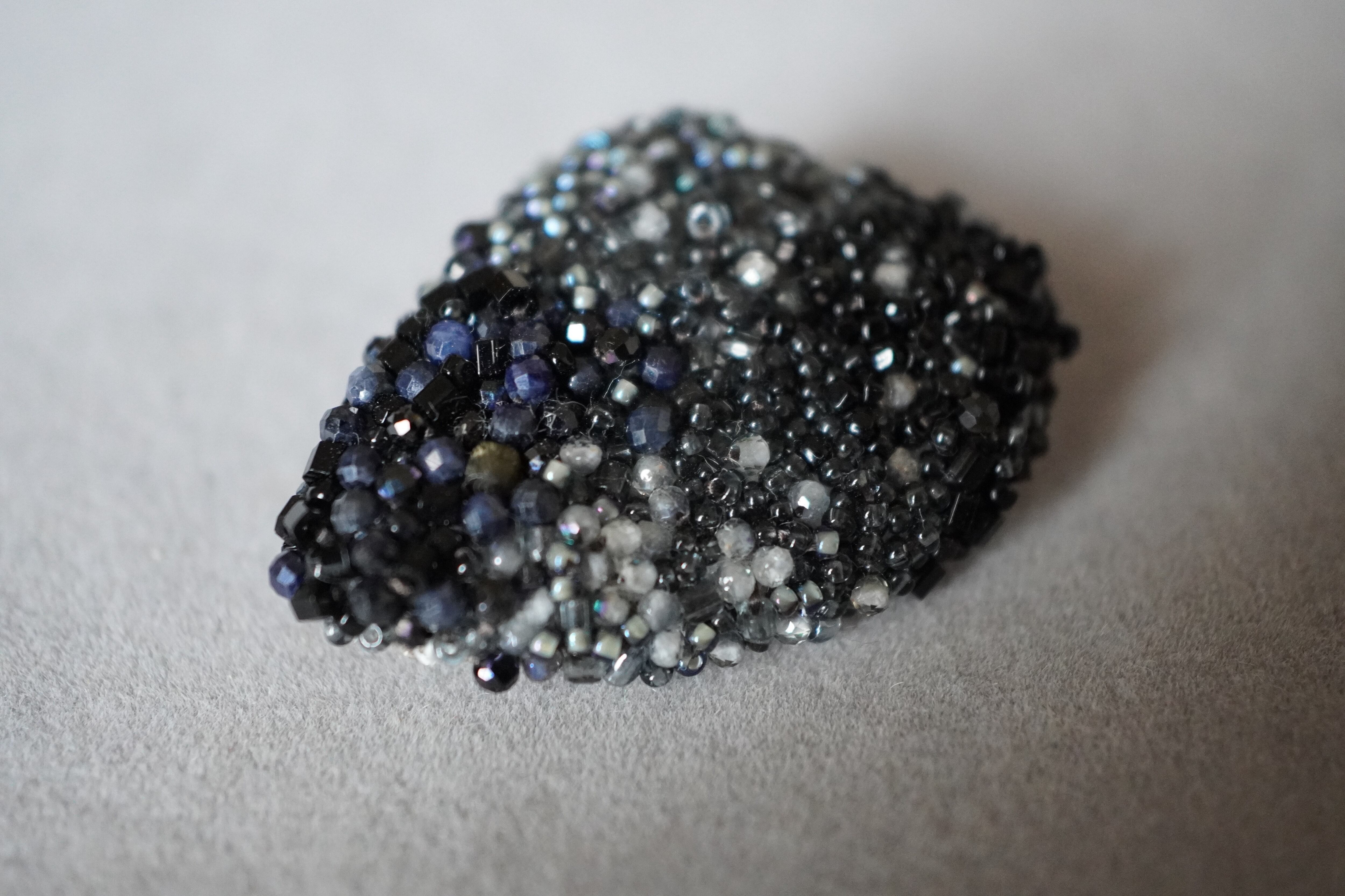 ガラスビーズにサファイア、ブラックスピネル、トパーズ、シルバーオブシディアンなど深く強い輝きを放つ石を贅沢に使い、手刺繍で丁寧に仕上げたブローチ。