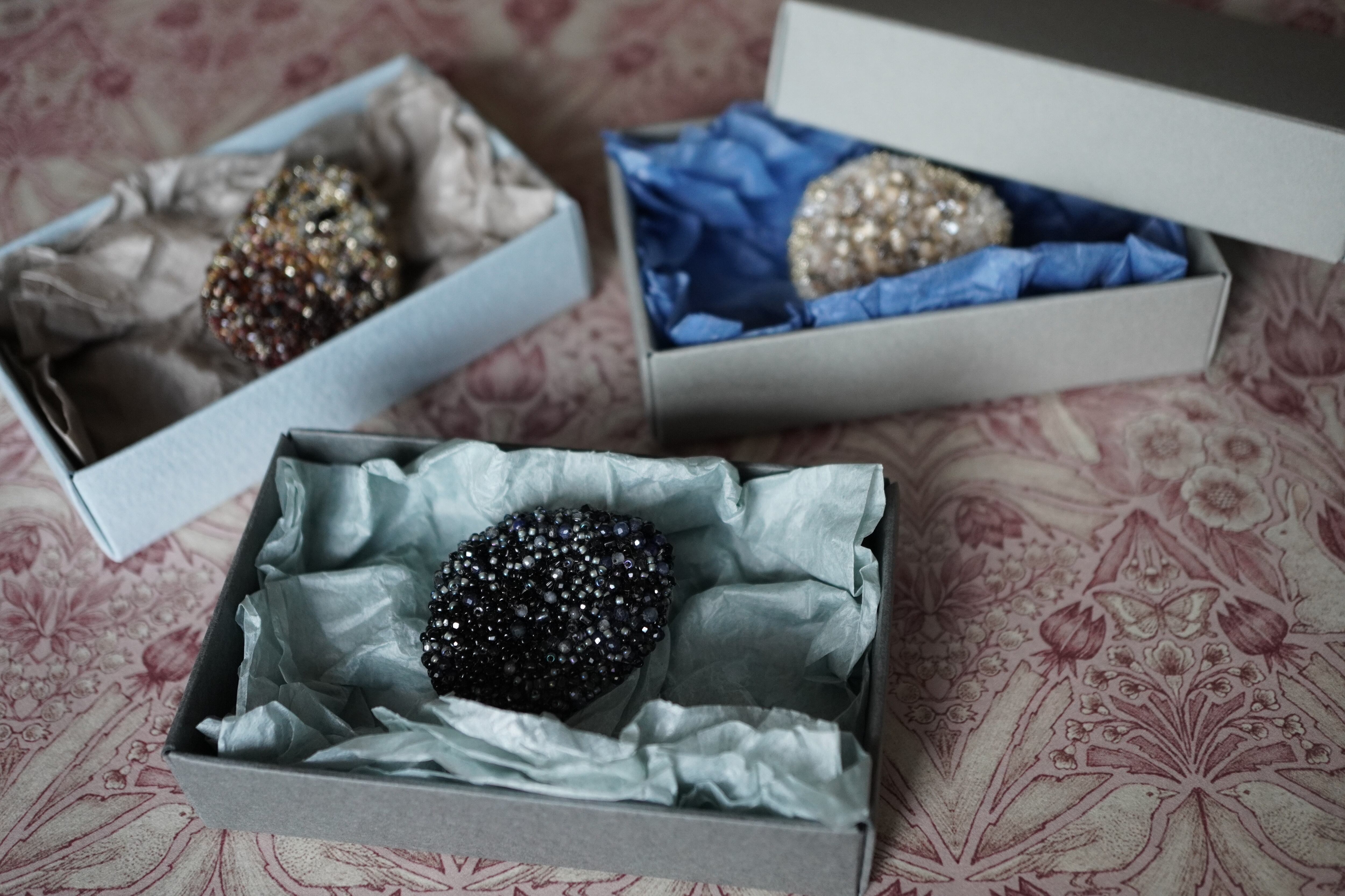 細かなガラスビーズを数種類使い、1粒1粒...繊細に刺し、静かな夜の空を表現。