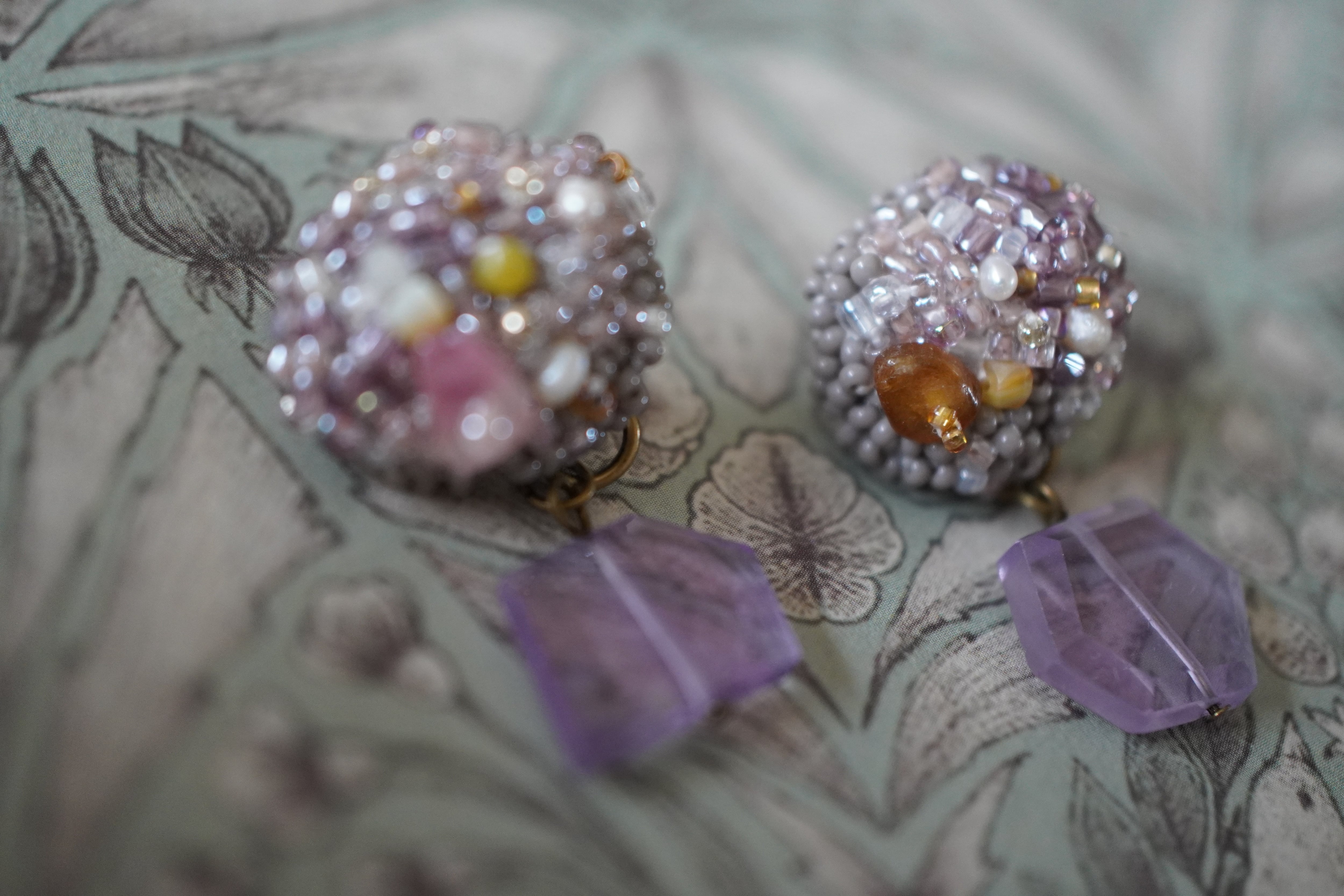 スライスカットのアメジストは揺れる仕様で、耳元に華やかな印象を与えてくれます。