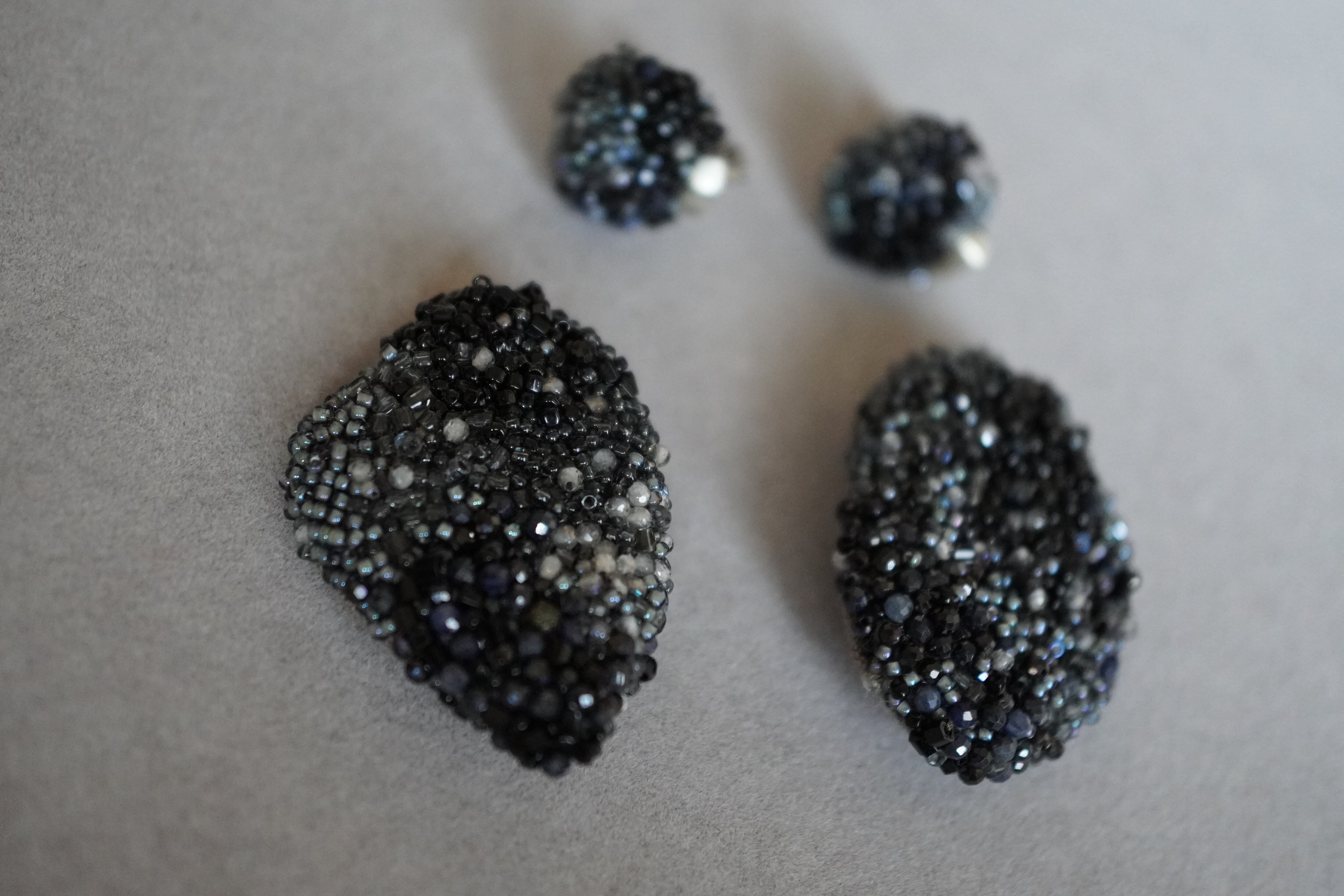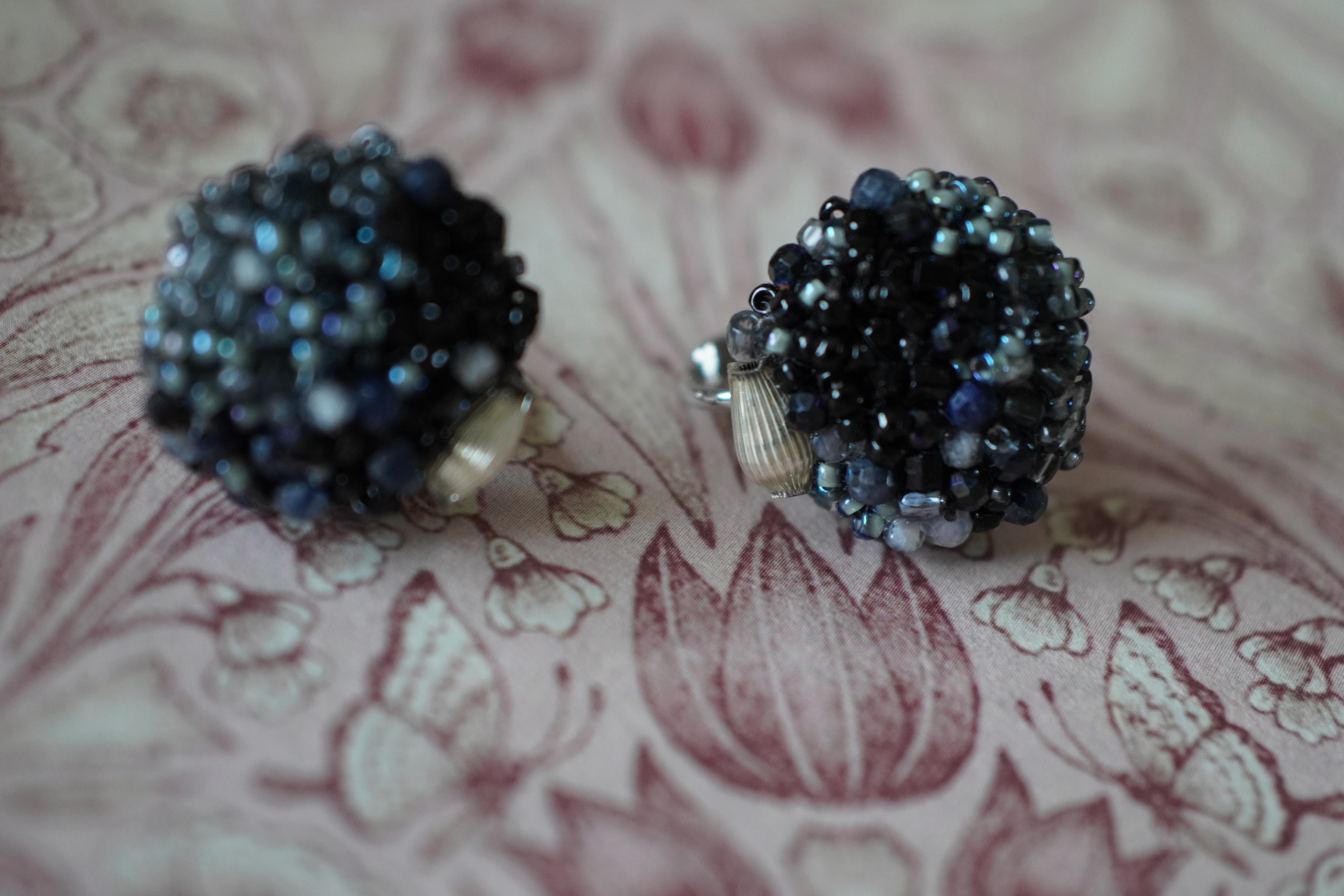 深く美しく輝くガラスビーズ、サファイア、ブラックスピネル、トパーズを手刺繍で丁寧に仕上げました。