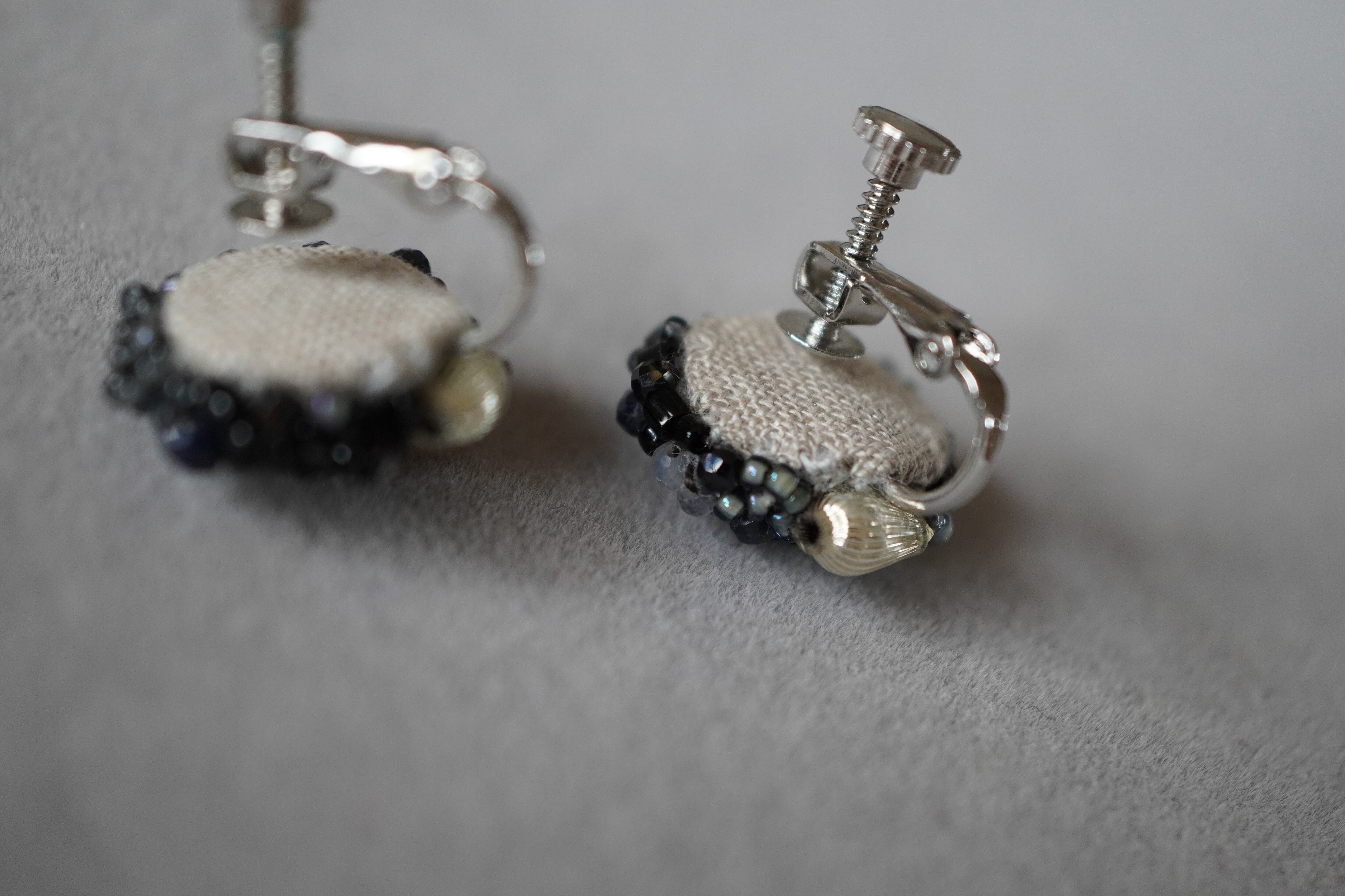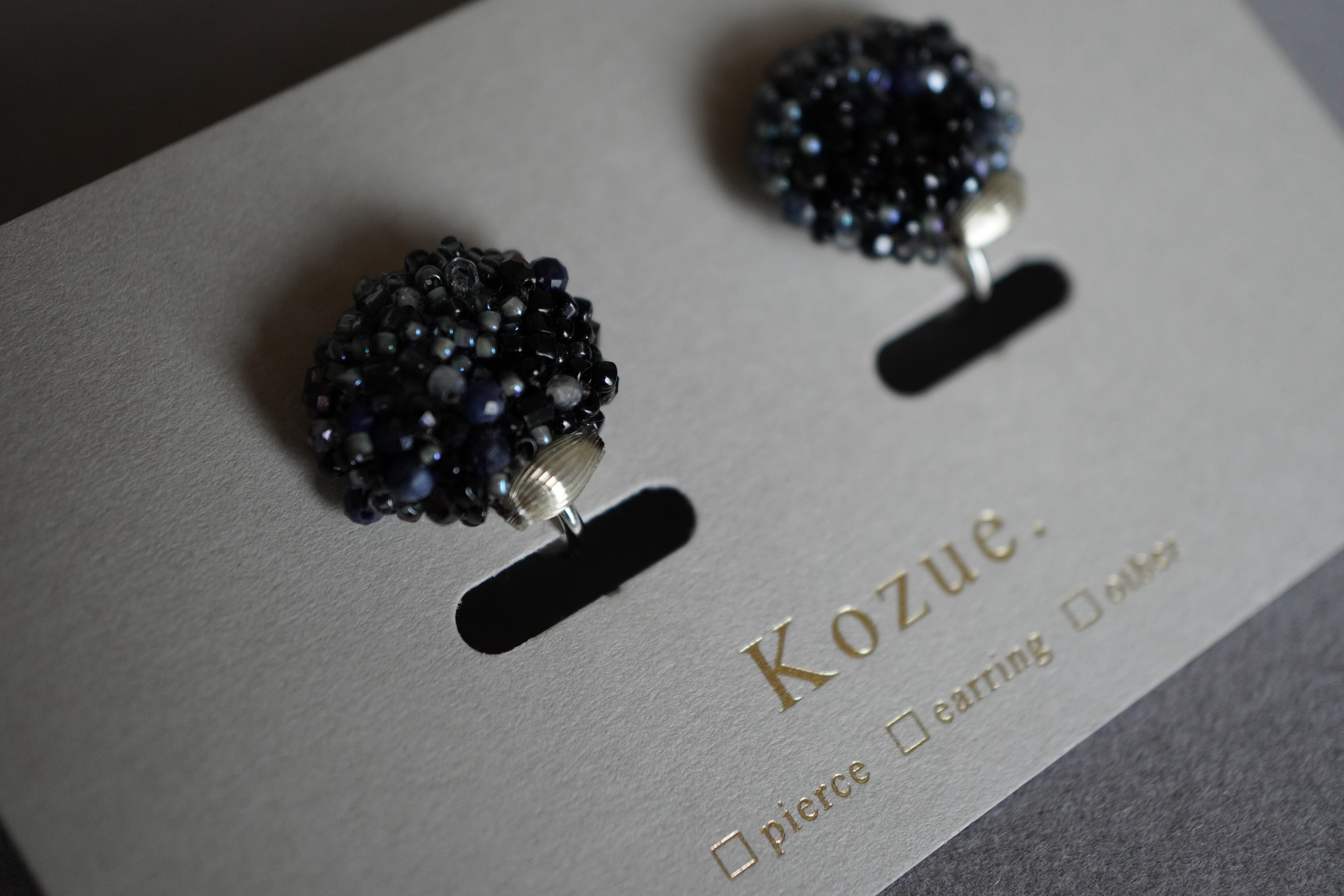 - 材質:ガラスビーズ、サファイア、ブラックスピネル、トパーズ、スフレビーズ、ポリエステル糸、イヤリング金具