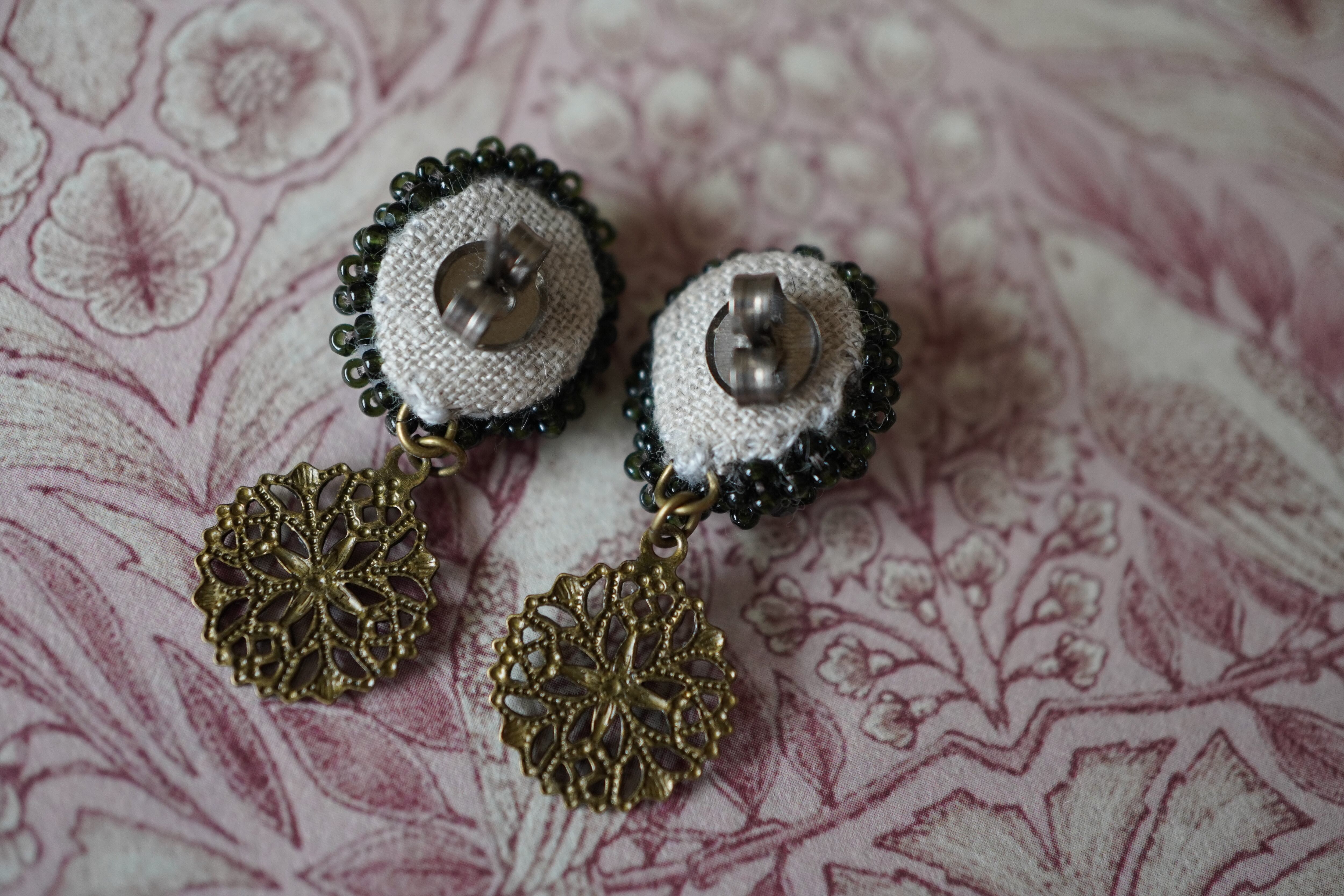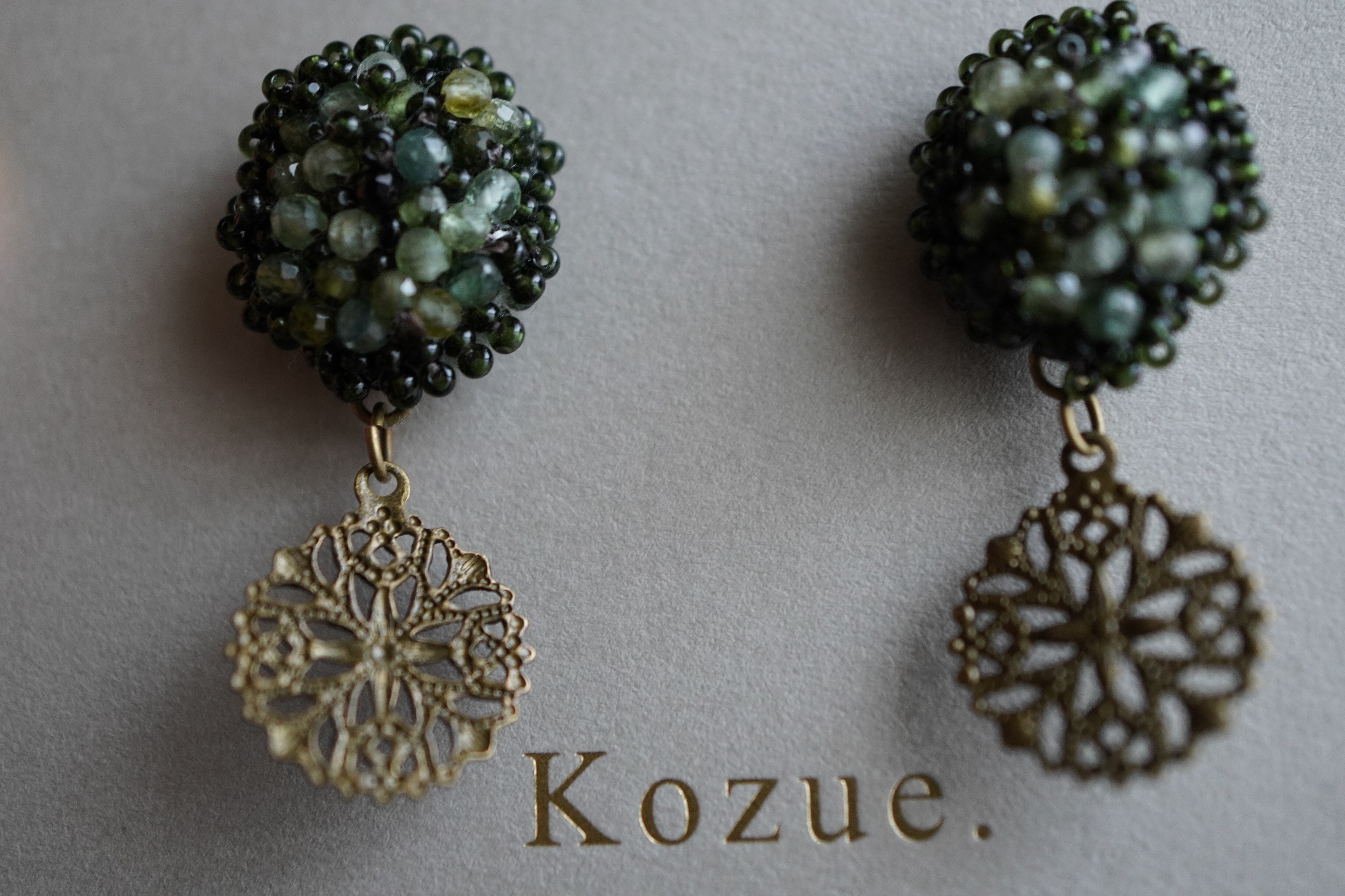 深く輝く美しい石グリーントルマリン...サイズの異なる2種類類に、ガラスビーズを刺繍したモチーフと、ブラスのレースパーツを合わせてピアスに仕立てました。