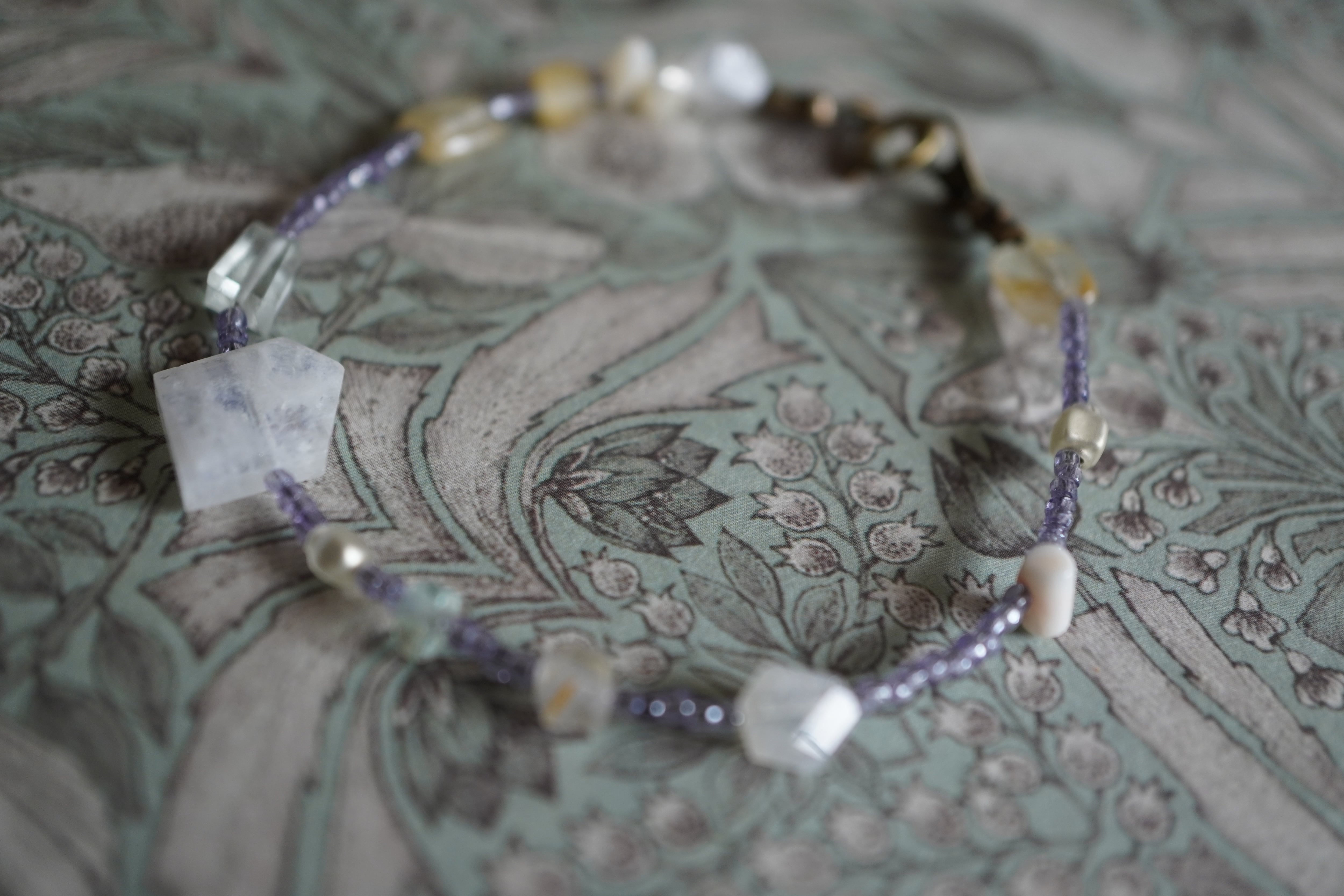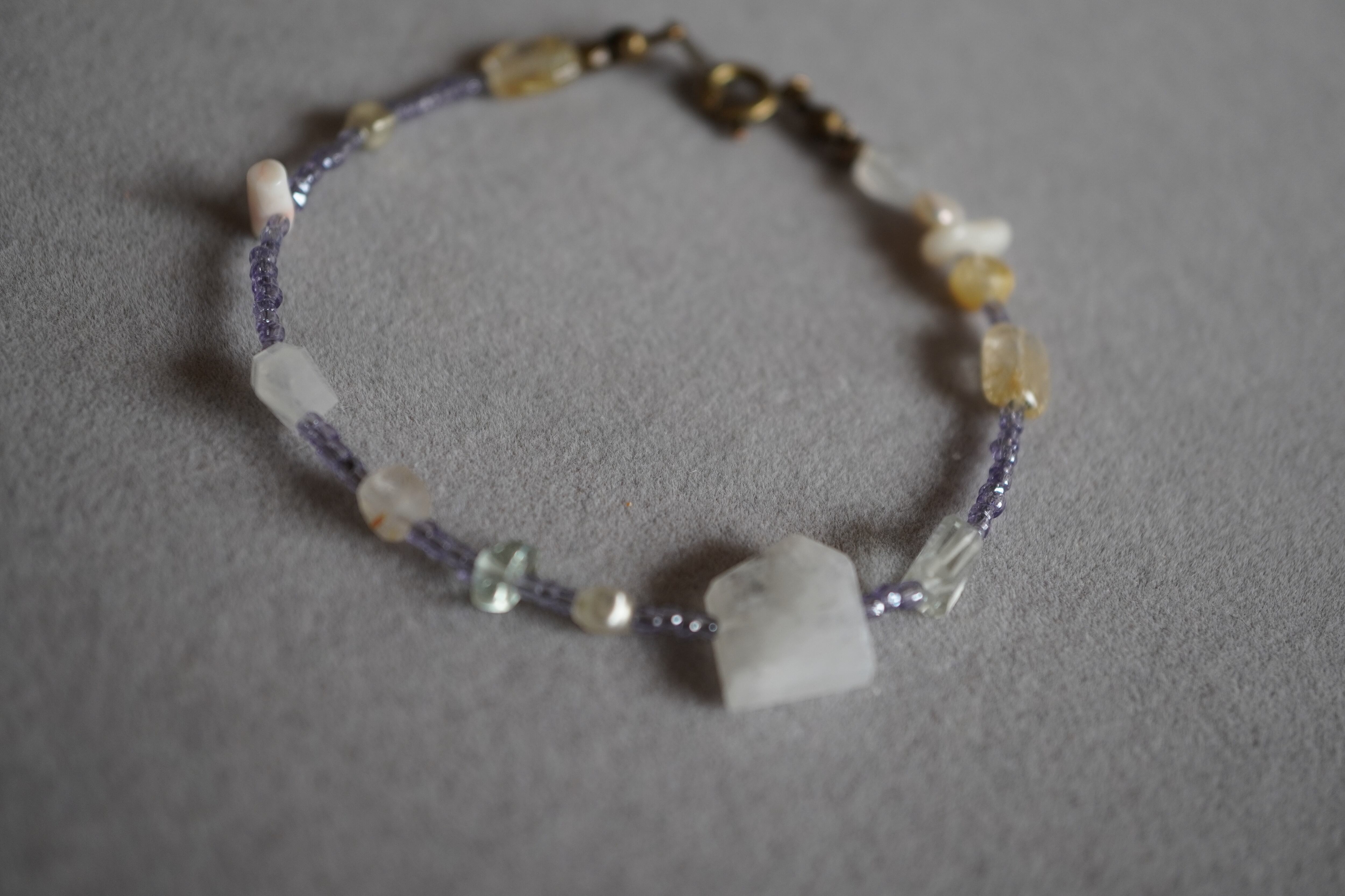 ラベンダーカラーのビンテージビーズに、ムーンストーン、グリーンアメジスト、ルチルクォーツ、珊瑚、パール、スフレガラスを組み合わせた、軽やかで涼しげな印象のブレスレットです。