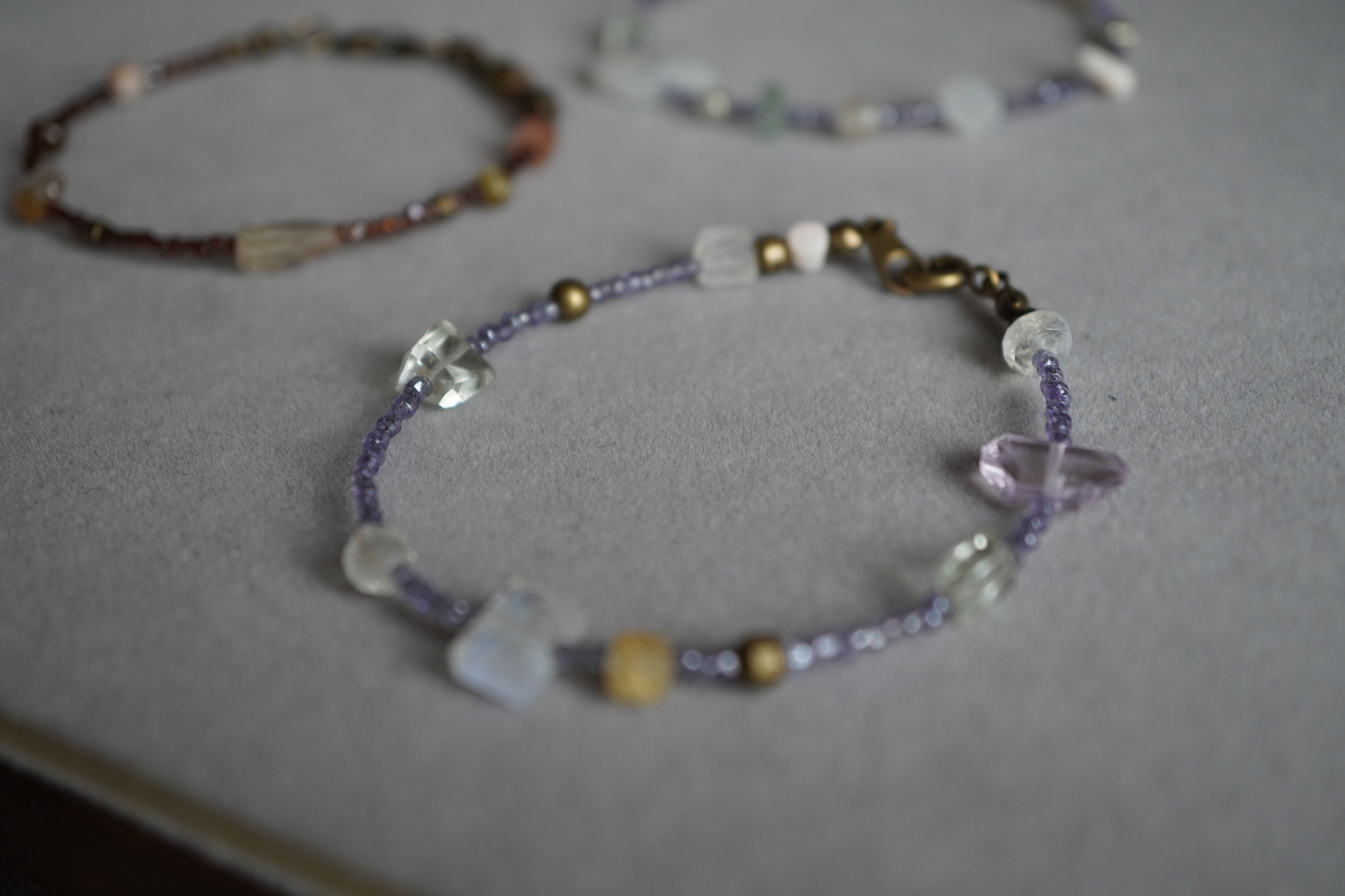 ラベンダーカラーのビンテージビーズと、繊細な輝きを持つ天然石を組み合わせたブレスレット。