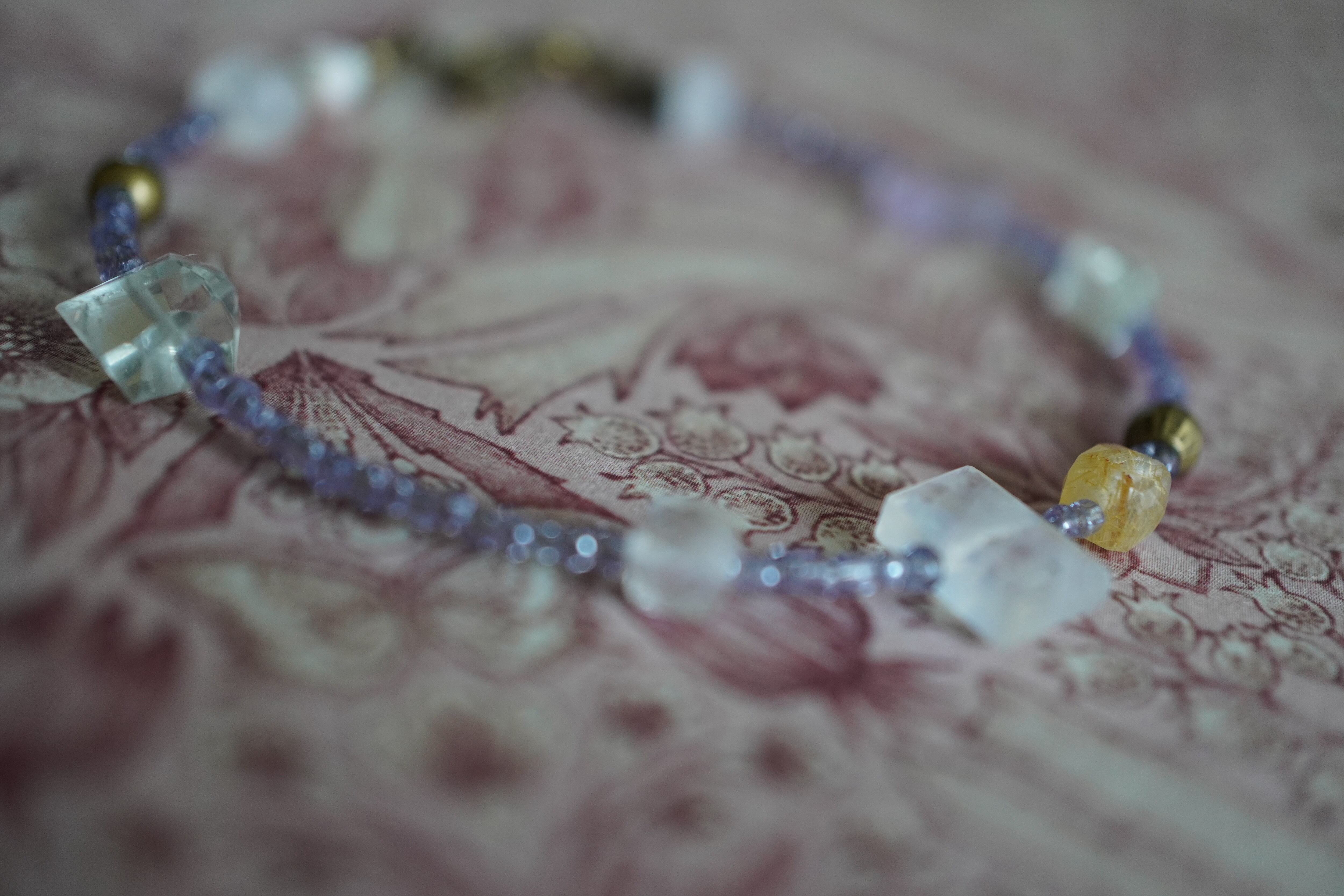 - 材質:ビンテージビーズ、グリーンアメジストムーンストーン、アメジスト、ルチルクォーツ、珊瑚、ブラスパーツ