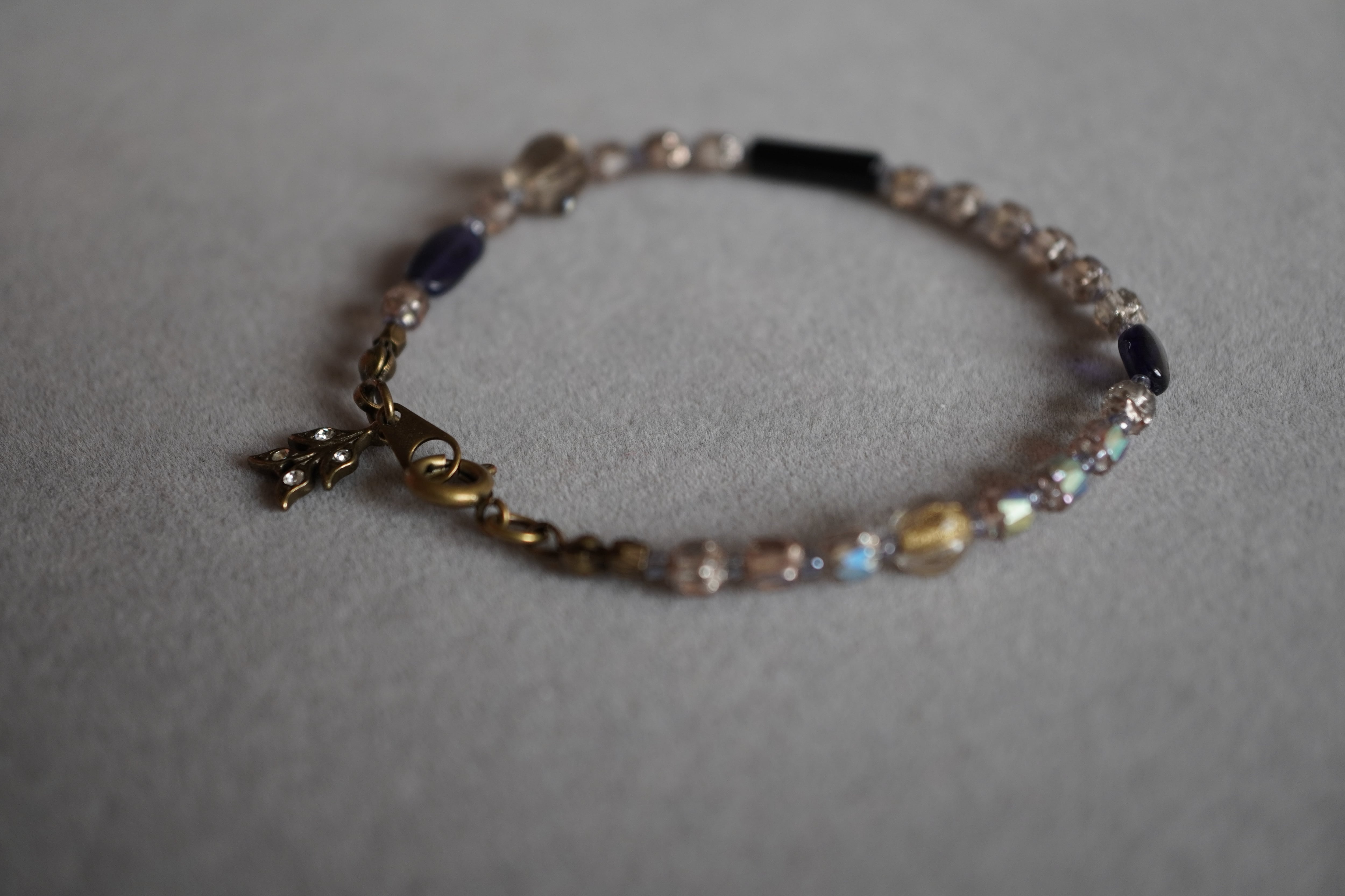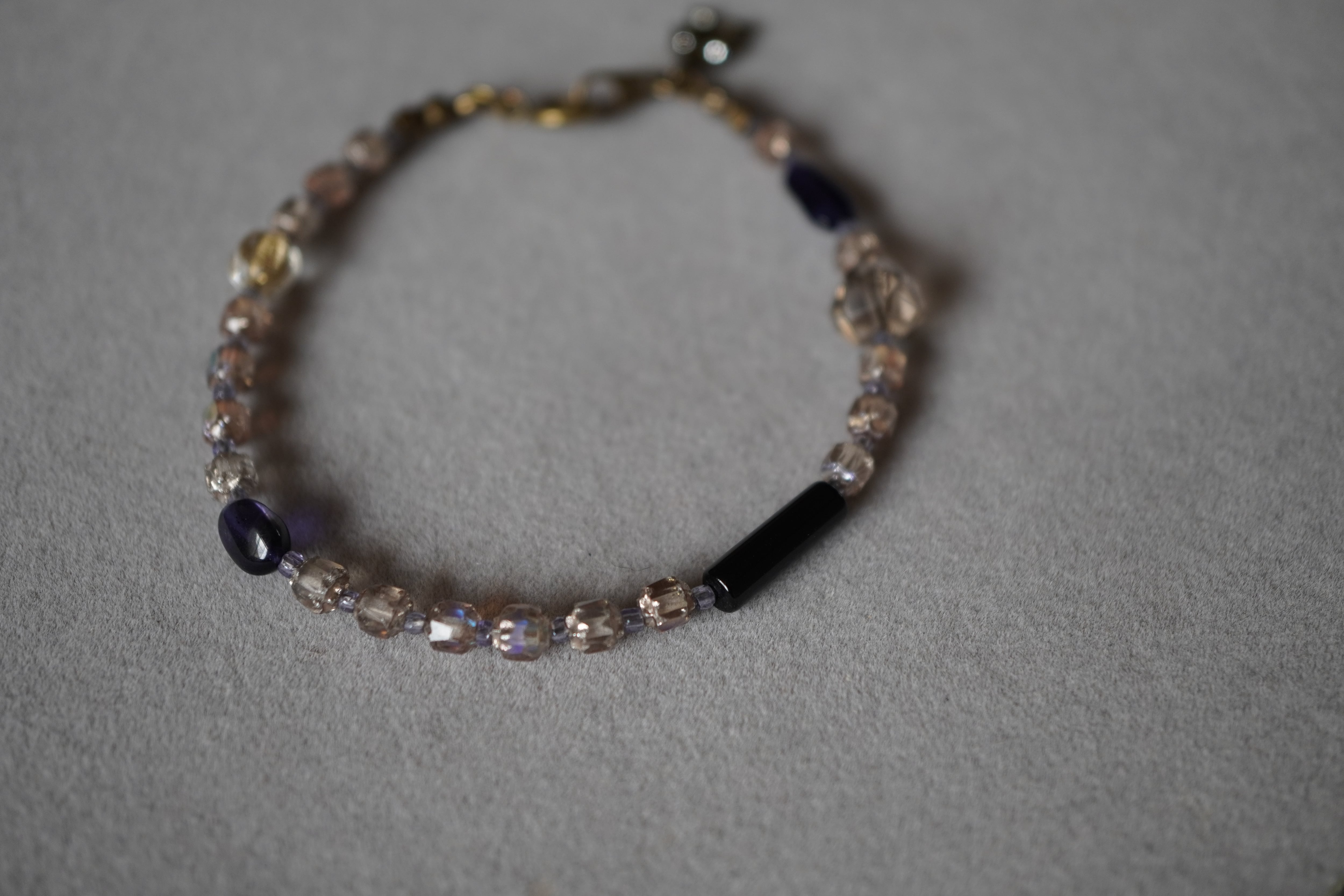 淡いグレーのチェコガラスに、アイオライト、スモーキークォーツ、オニキスを組み合わせた、洗練された印象のブレスレットです。