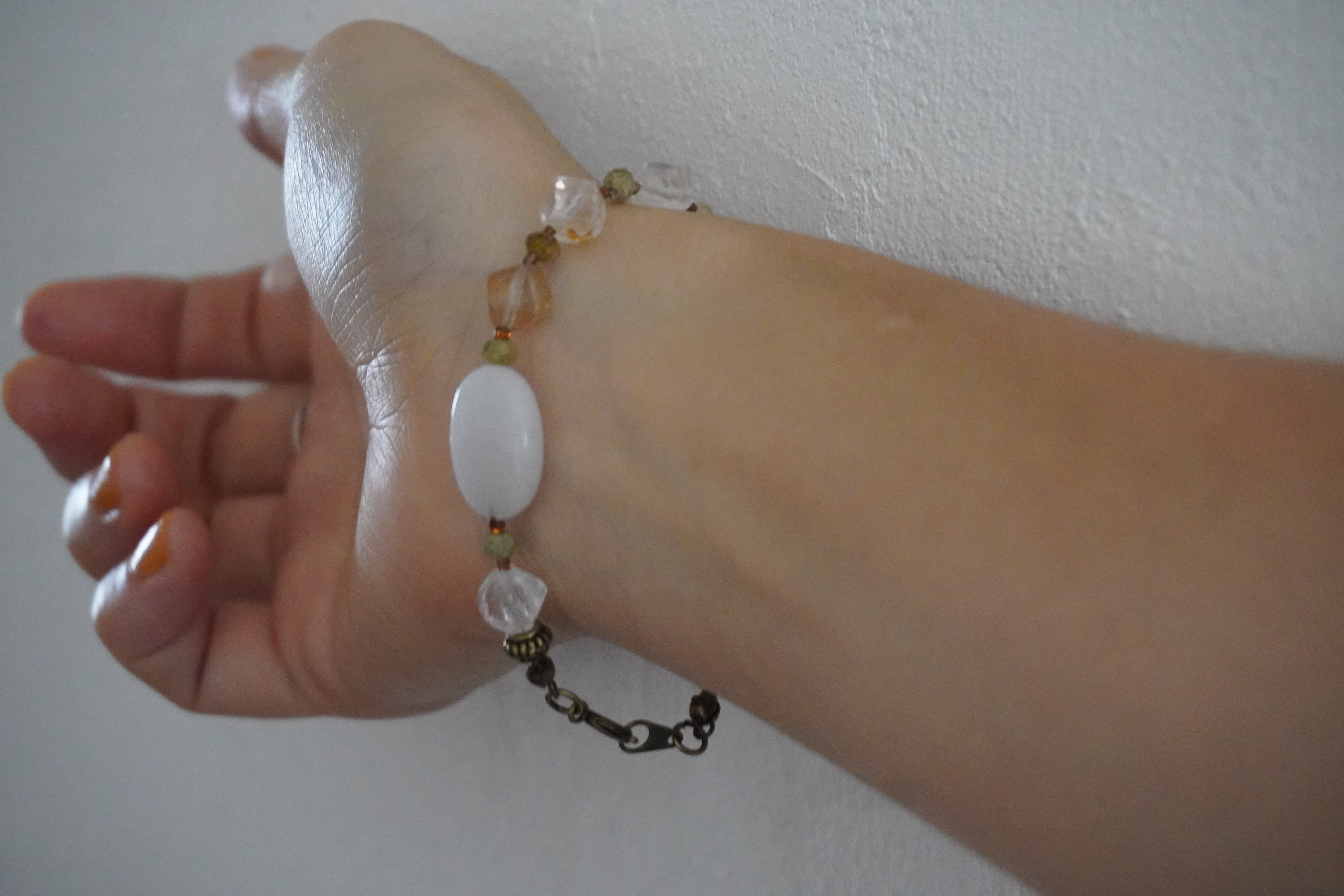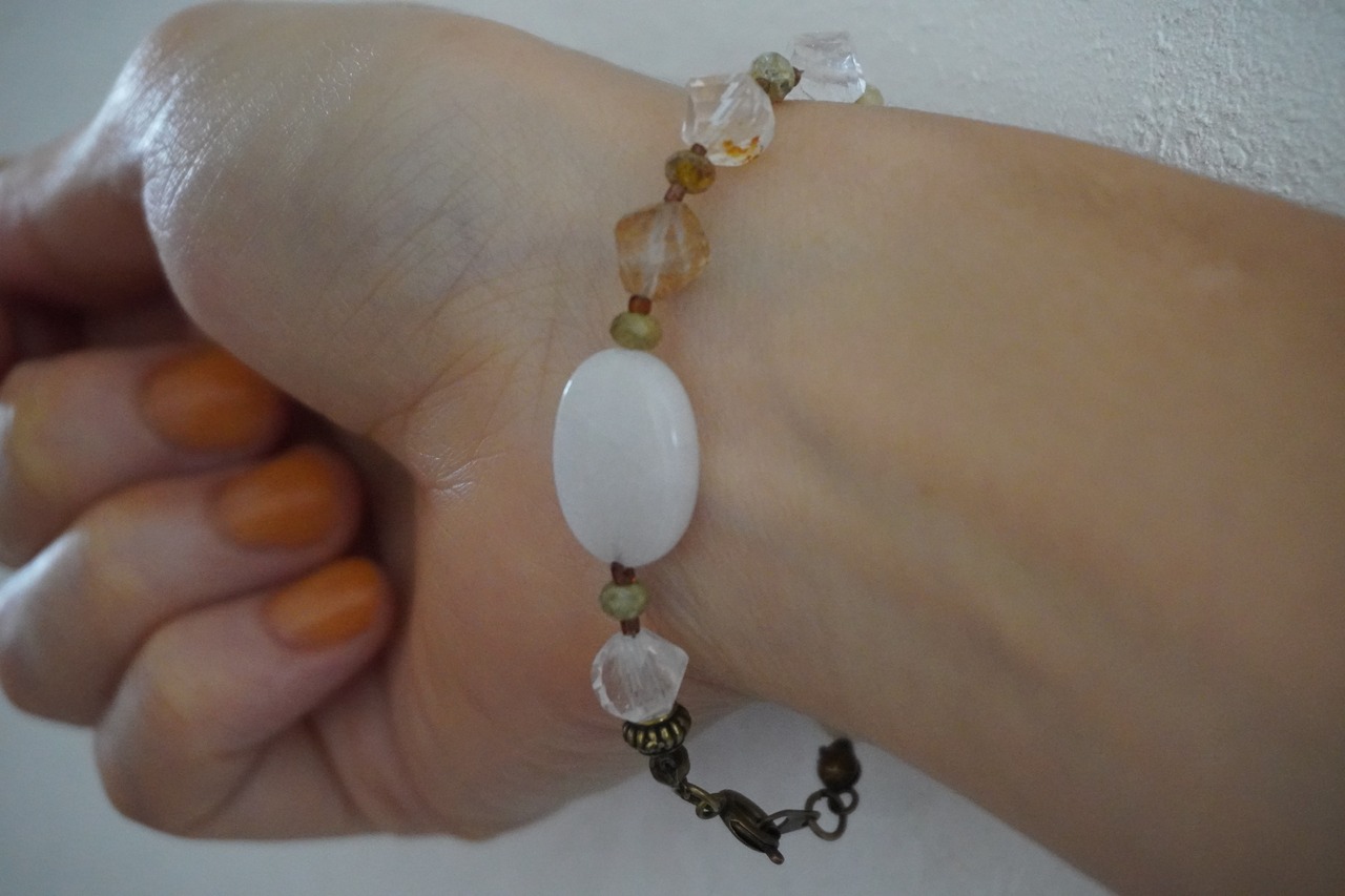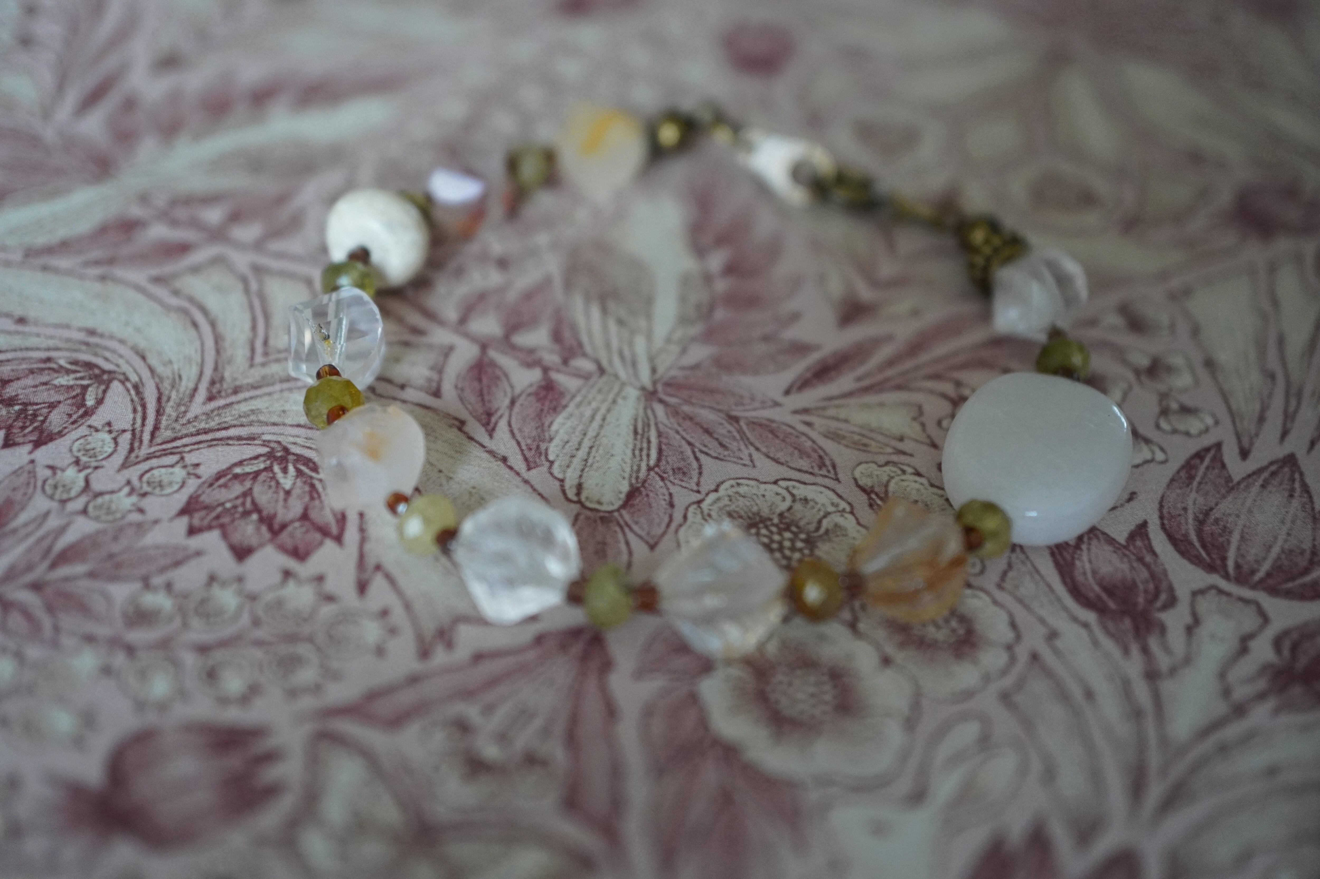 - 材質:イエローヘマタイトクォーツ、グロッシュラーガーネット、ビンテージビーズ、ホワイトジェイド 、リバーストーン、ブラスビーズ