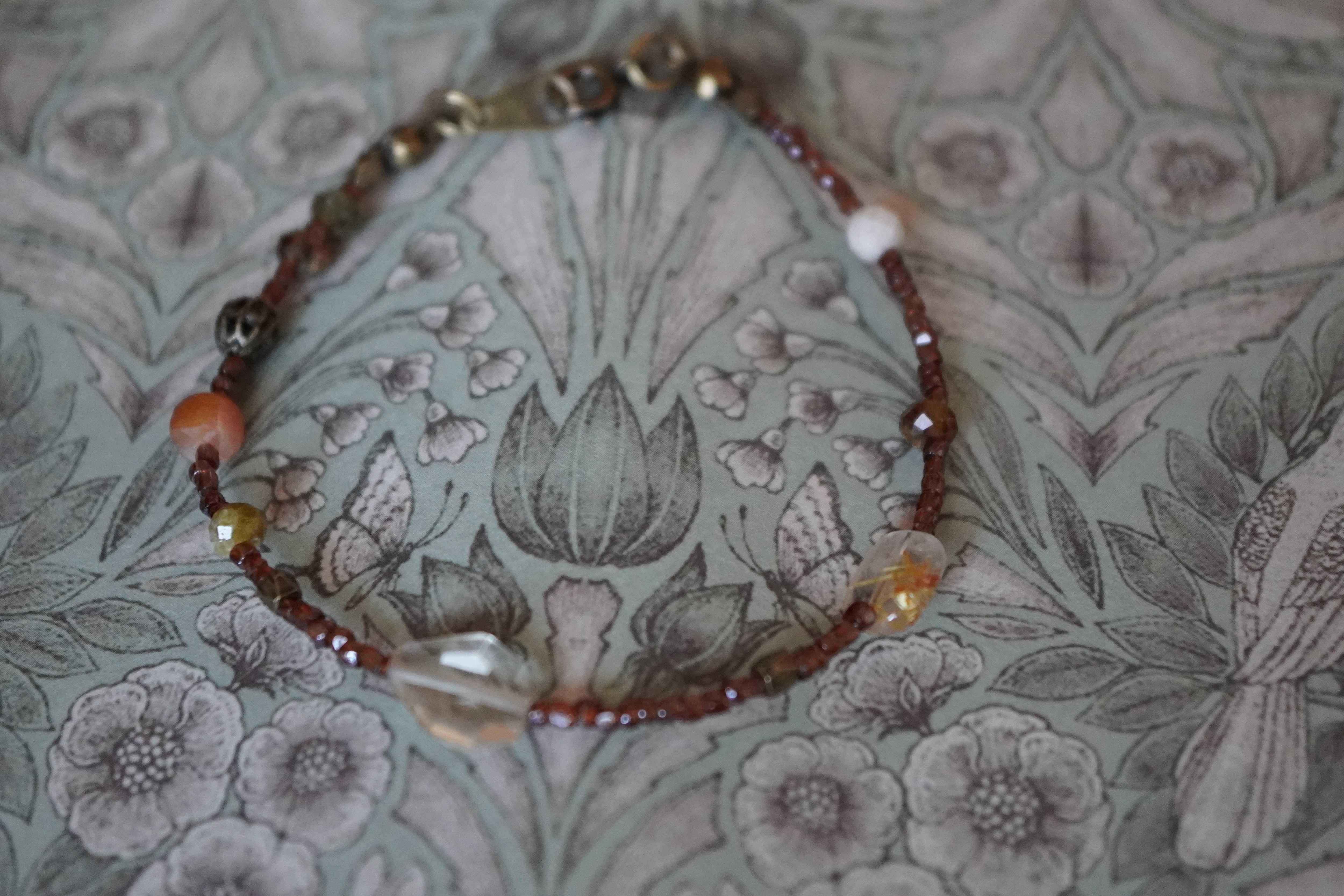 ブラウンのビンテージビーズに、ナチュラルなカットが美しく輝くオレゴンサンストーン、グロッシュラーガーネット、ルチルクォーツ、化石珊瑚、ブラウンシャインムーンストーン、ブラスビーズを組み合わせ、温かみのある印象を与えています。