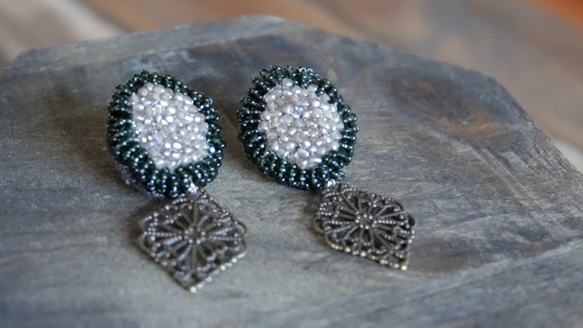 ガラスビーズの手刺繍によるモチーフと、レース模様の透かしブラスビーズを組み合わせたピアスです。1点ものです。