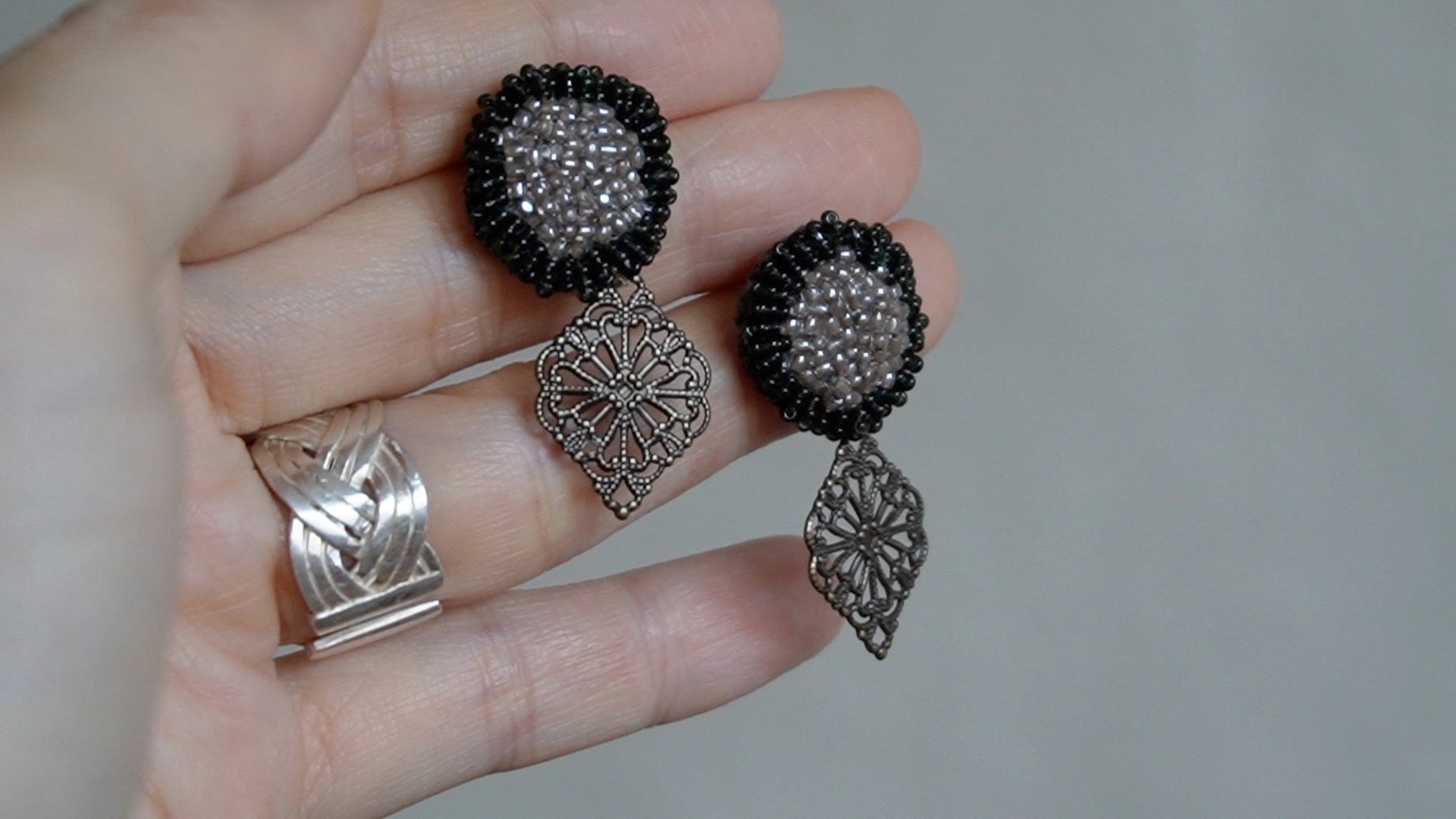 手刺繍の温かみが感じられるビーズのモチーフに、レース模様のパーツが大人っぽい雰囲気です。(レースパーツは、糸で縫い付けてある為、揺れ感はありません。)