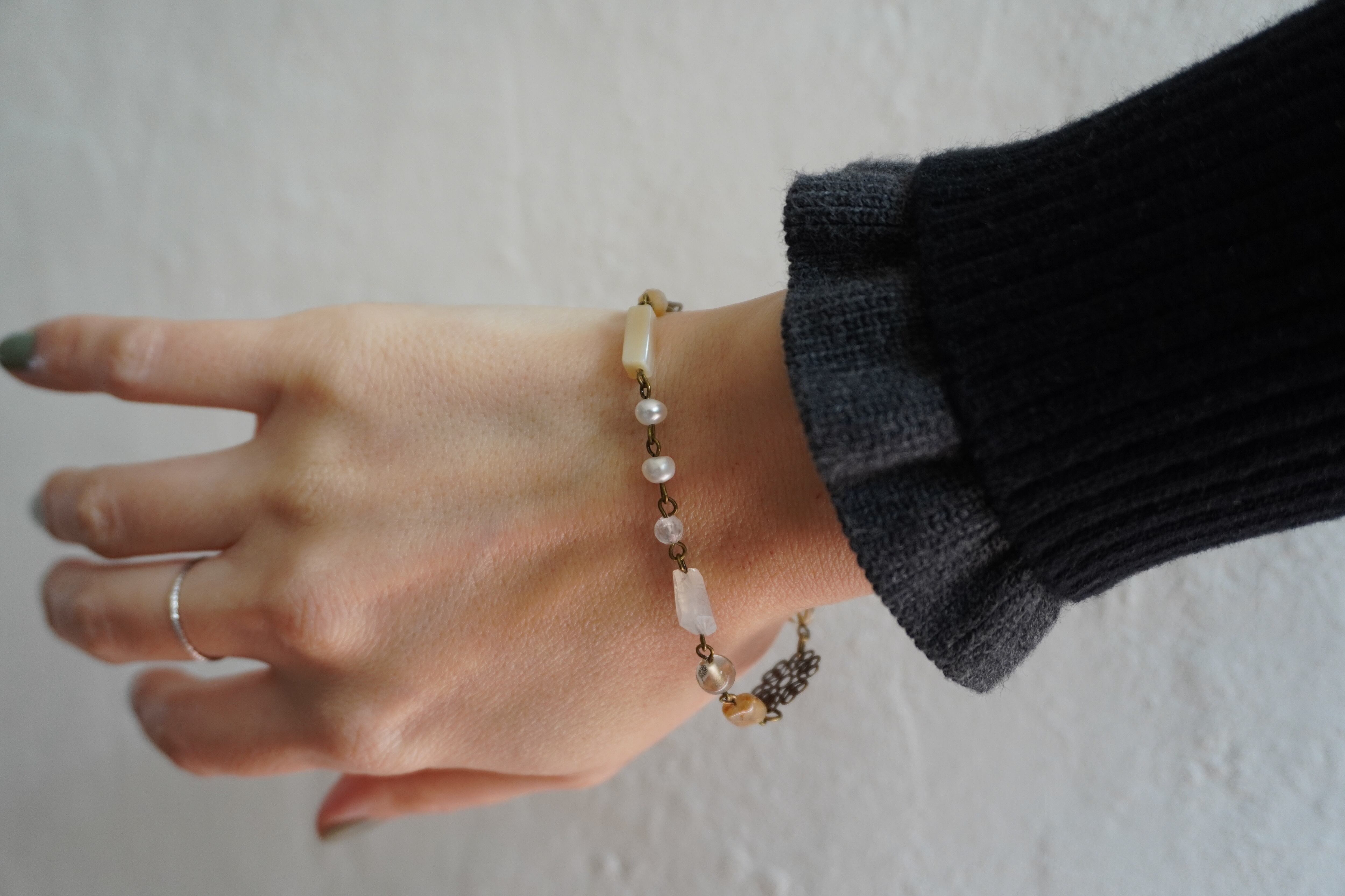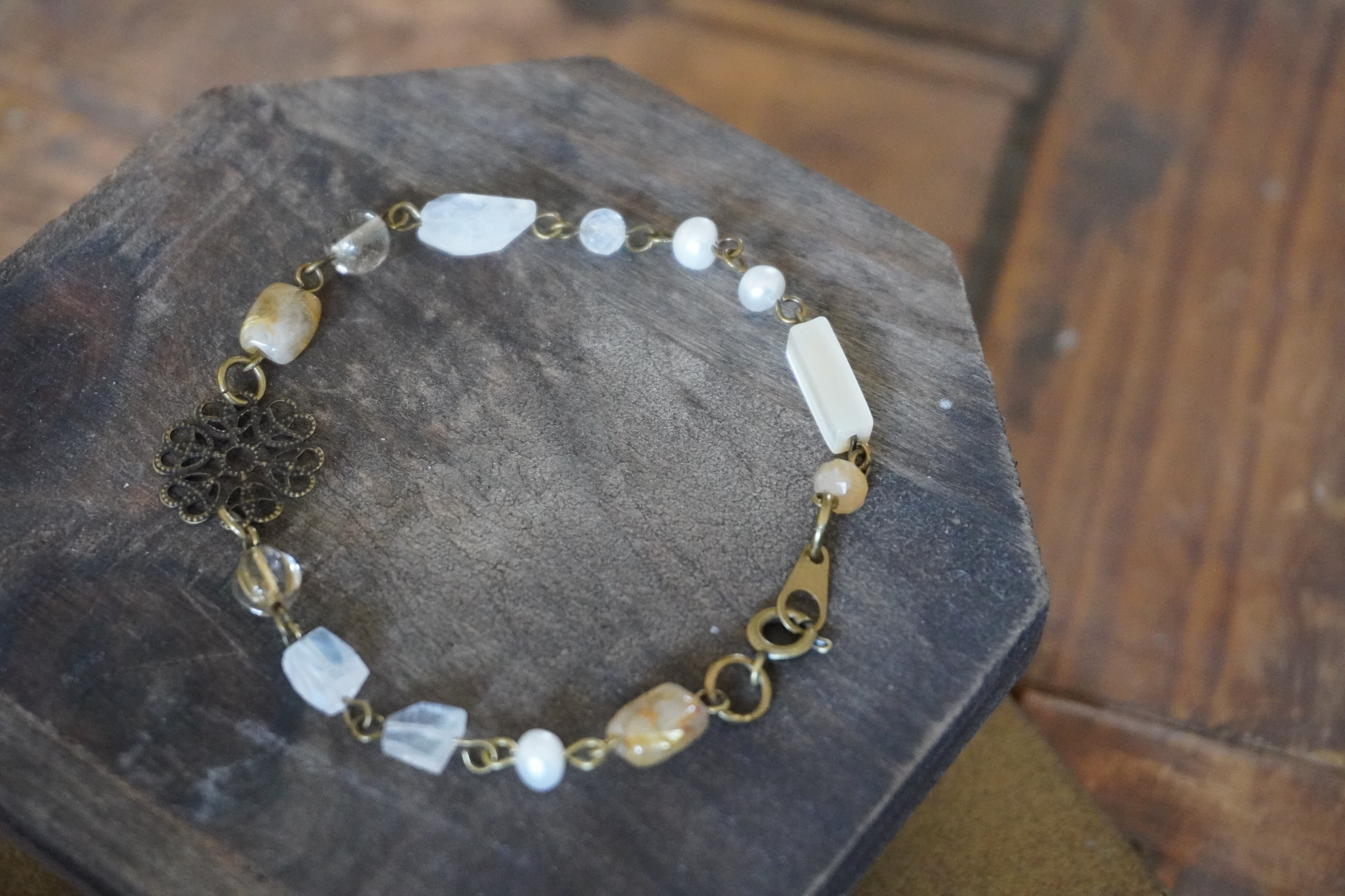 レース模様のブラスパーツにムーンストーン、ルチルクォーツ、パール、高瀬貝、チェコガラスを組み合わせた、優雅な印象のshineブレスレット。光を受けて美しく輝き、手元を明るく見せてくれるアクセサリーです。